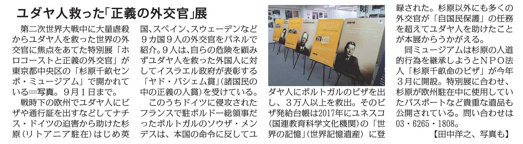 Tokyo Shimbun (August 21) introduced our ongoing special exhibition “Beyond Duty,” celebrating nine wartime diplomats (including Chiune Sugihara) who have been declared Righteous Among the Nations by Yad Vashem for rescuing Jewish refugees from the Holocaust. After describing the exhibition in some detail, the article goes on to discuss the recent visit by American visitor Chaya Small, who was able to escape Lithuania as a small girl thanks to a visa issued by Sugihara. It notes that the museum, normally closed on Mondays, was opened specially for her, with the Sugihara family there to greet her personally. She is quoted as saying how moved she was to meet the family and how deeply grateful she remains even now for Chiune’s humanitarian deeds. She also recalled the happy time she spent in Kobe those many years ago.