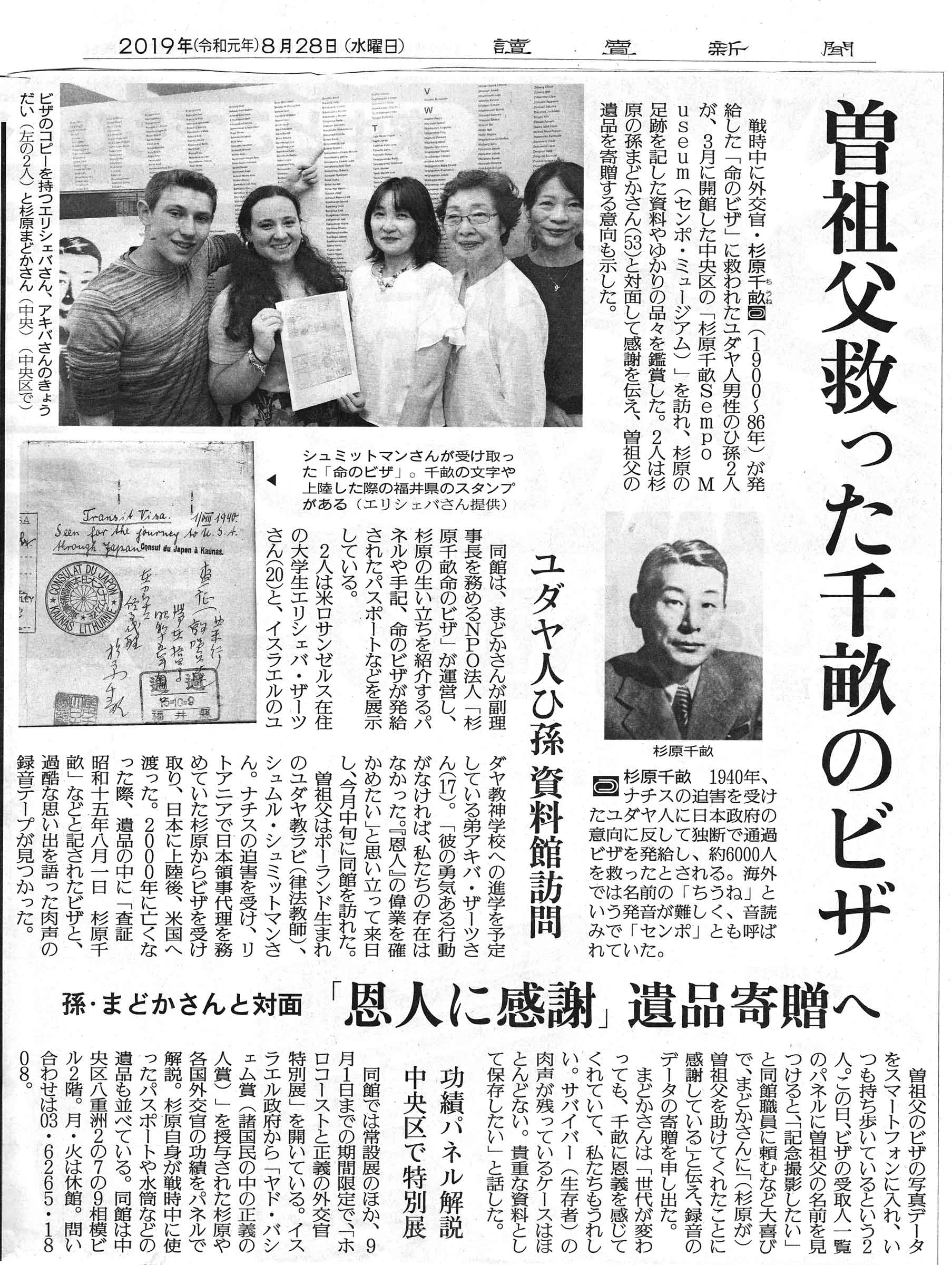Yomiuri Shimbun (August 28), the nation’s largest daily, interviewed two great-grandchildren of a Sugihara survivor visiting from Los Angeles. The museum had been surprised when siblings Elisheva and Akiba Zahtz showed up several days earlier looking for their great-grandfather’s name on the museum’s Wall of Survivors, and Yomiuri wanted to meet them and ask their story. They told of how they learned of their relative’s harrowing experience only after he died in 2000 from a recording he left behind. They keep a picture of his visa on their phones. Discovering the museum online, they made it a point to stop by and pay their respects during their trip to Japan and were delighted to meet the family of the man responsible, as they say, for their very existence. They offered to share the recording with the museum, a particularly valuable item for us as few such materials exist from direct survivors. The siblings probably never imagined that they would become media stars in Tokyo. The photo shows them holding a copy of the visa alongside the Sugihara family.